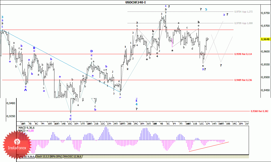 Инструмент находится в стадии построения повышательного участка тренда, но волновая разметка последних недель выглядит довольно запутанно. Повышение котировок может возобновиться в рамках предполагаемой волны 3 в 5, с целями, расположенными около отметки 0,9754, что соответствует 127,2% по Фибоначчи, и выше. В рамках нисходящей коррекционной волны (возможно 2 в 5) понижение котировок может продолжиться с целями, находящимися вблизи отметок 0,9590 и 0,9489, что приравнивается к 11,4% и 23,6% по Фибоначчи. Конвергенция MACD_ака предупреждает о готовности инструмента к завершению построения коррекционной волны.