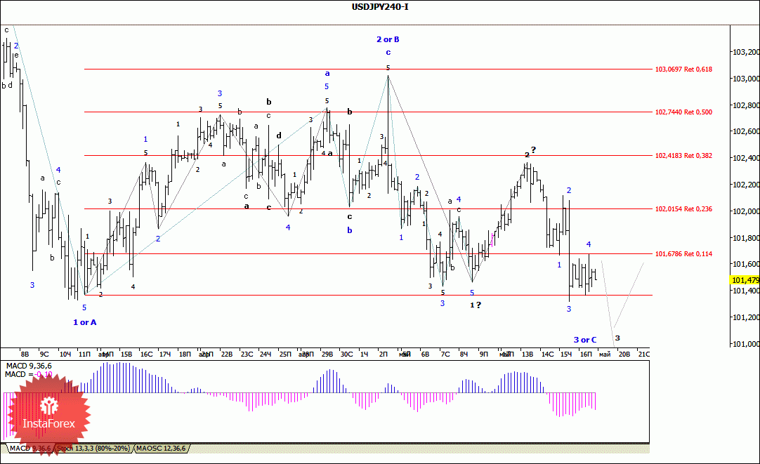 Инструмент продолжает построение понижательного участка тренда, который принимает весьма сложный вид. Понижение котировок может продолжиться с целями, расположенными около отметок 101,33 и 100,75, что соответствует 200,0% и 261,8% по Фибоначчи. В рамках повышательной коррекционной волны, может начаться повышение с целями, находящимися около расчетных отметок 102,01 и 102,41, что приравнивается к 23,6% и 38,2% по Фибоначчи. Внутренняя волновая структура предполагаемой волны 2 или b приняла очень сложный и протяженный вид, волна 3 или с также может получиться весьма сложной и протяженной.