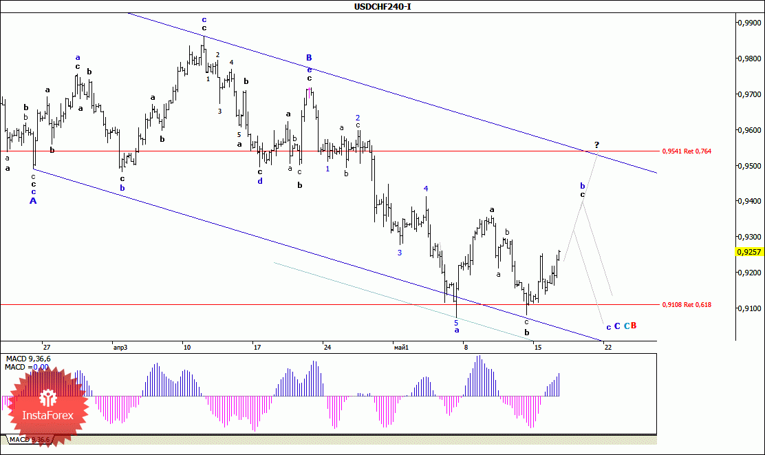 Не найдя оснований для возобновления нисходящего движения, вчерашние торги пара USD/CHF начала с роста котировок и, потеряв до конца дня более 110 п.п., закрепилась над отметкой 0,9250. Таким образом, похоже на то, что отход цены от минимума 7 мая можно рассматривать как процесс формирования волны с, в С, в С, в которой ее волна b значительно усложнила свою волновую структуру. Если это так, то текущий рост котировок может получить дальнейшее развитие в направлении целей, расположенных в достаточно широком диапазоне между уровнем 94 фигуры и отметкой 0,9540.