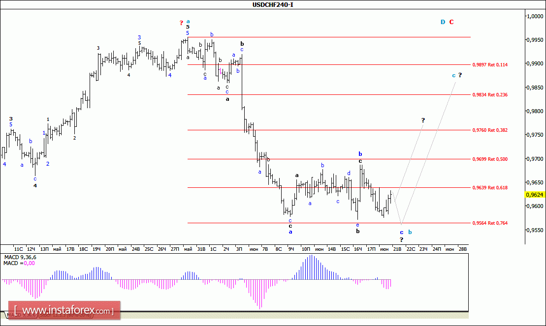 В преддверии британского референдума, уже восьмую торговую сессию подряд, пара USD/CHF проявляет осторожность, оставаясь в диапазоне между отметками 0,9570-0,9670. При этом, несмотря на то, что после вчерашнего снижения цены к отметке 0.9575, волновая структура волны с, в b, в D, в С, приобрела несколько укороченный вид, валютная пара может продолжить начавшийся рост котировок и обозначить начало будущей волны с, в D, в С. В то же время нельзя исключать вероятности некоторого усложнения этой волны с, в b, в D, в С, в результате снижения котировок как минимум к отметке 0,9565.