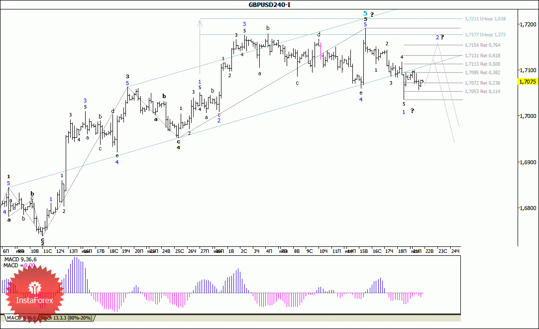 В целом ожидаемо, в ходе вчерашних торгов паре GBP/USD не удалось возобновить сколь-нибудь значимое нисходящее движение и до конца дня цена оставалась между отметкой 1,7055 и уровнем 71-й фигуры. Таким образом, можно предположить, что валютная пара предпринимает попытки сформировать первые волны, в составе более сложной и протяженной во времени понижающей коррекционной структуры. Если это так, то в процессе развития 2-й волны такой коррекции цена может отойти вплоть до отметки 1.7155 или даже к 1,7175.