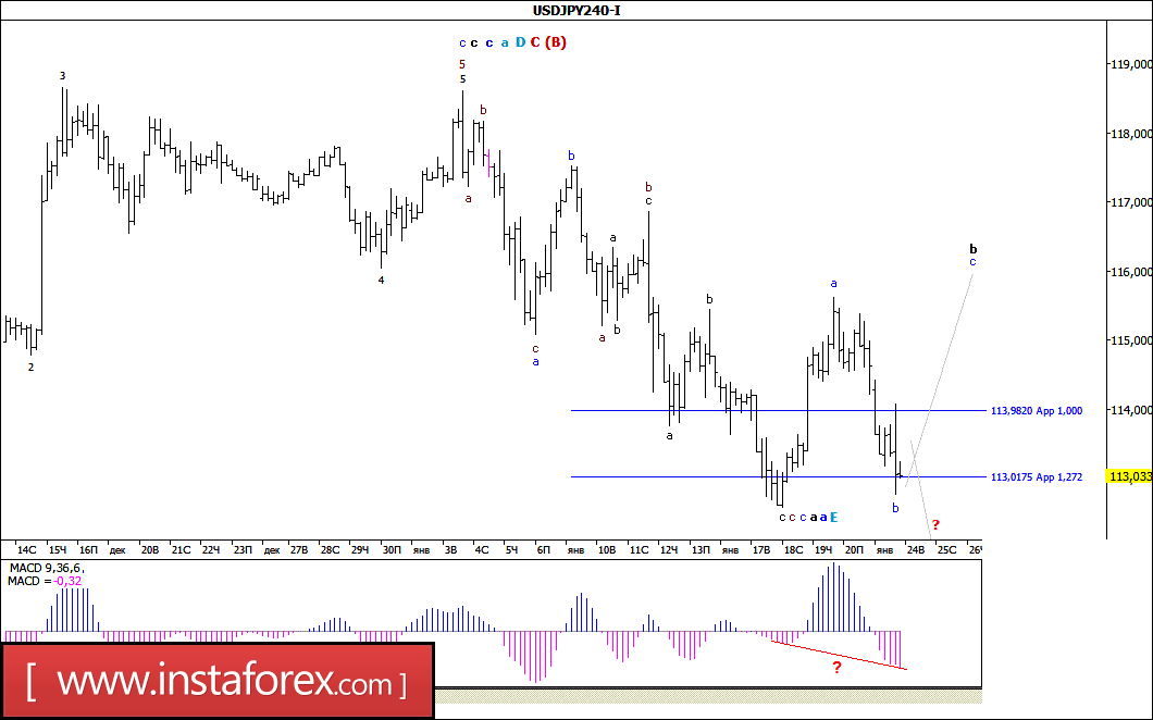 Инструмент предположительно завершил построение волны D в С в (B). В рамках волны b в а в E в С в (B) повышение котировок может возобновиться с целями, расположенными около 117 фигуры. В рамках построения нисходящей коррекционной волны, возможно b в b в а в E в С в (B), понижение котировок продолжается с целями, находящимися около расчетной отметки 113,01, что приравнивается к 127,2% по Фибоначчи. Дивергенция MACD_ака предупреждает о готовности инструмента к повышению.