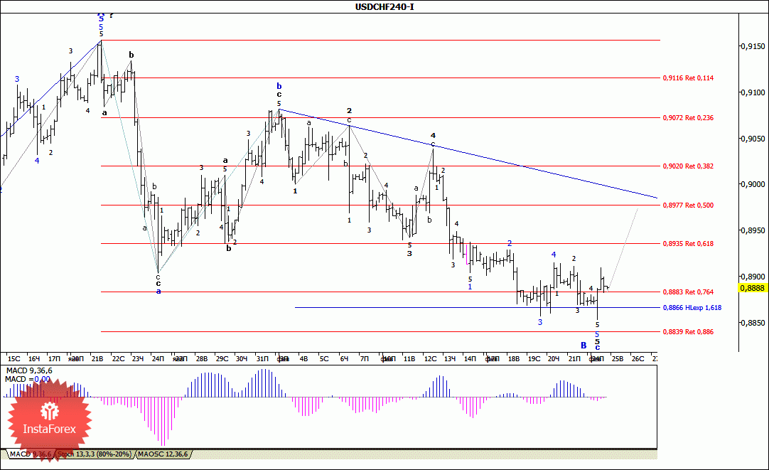 Вчерашнее обновление достигнутого 19 февраля минимума и снижение пары USD/CHF практически к отметке 0.8850 привело к отскоку цены выше уровня 89-й фигуры. При этом внутренняя волновая структура всей волны с, в В, претерпела существенные изменения, что привело к необходимости корректировки ее разметки. В то же время, несмотря на сложившиеся условия, валютная пара по-прежнему сохраняет потенциал для скорого перехода в стадию формирования будущей волны С.