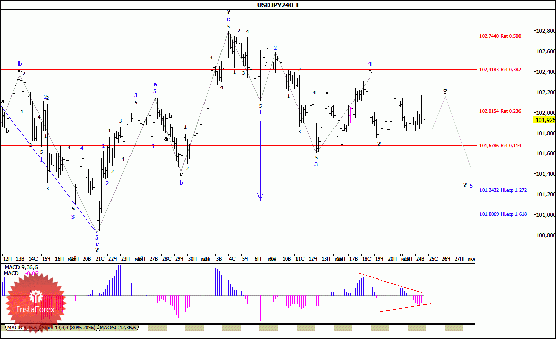 Инструмент запутывает волновую разметку и может трансформировать участок тренда, берущий начало 4 июня, в 5-волновой. Повышение котировок может возобновиться в рамках нового повышательного участка тренда с целями, расположенными около отметок 102,41 и 102,74, что соответствует 38,2% и 50,0% по Фибоначчи. В рамках понижательной волны, возможно 5 в составе нисходящего участка тренда, может продолжиться понижение с целями, находящимися около расчетных отметок 101,67 и 101,24, что приравнивается к 11,4% и 127,2% по Фибоначчи. Волна 5 может принять в свою очередь 5 волновой вид.