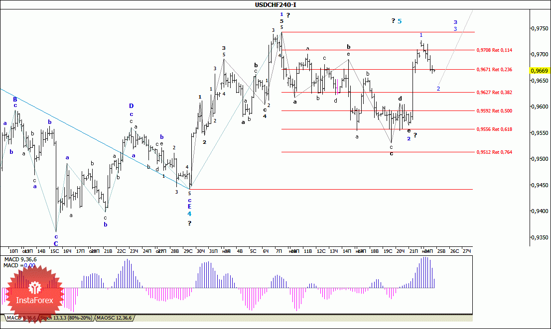 Начав вчерашние торги с ожидаемого нисходящего движения, пара USD/CHF потеряла более 50 п.п. и во второй половине дня отработала отметку 0,9670. При этом такое снижение цены выглядит как процесс формирования коррекционной 2-й волны, в составе будущей 3-й, в 5-й. Если это так, то складывающаяся волновая ситуация позволяет предполагать, что от минимума минувшего дня (или после достижения отметки 0.9640) валютная пара может возобновить рост котировок в направлении первой возможной цели для 3-й волны, в 3-й, в 5-й, соответствующей уровню 98-й фигуры.