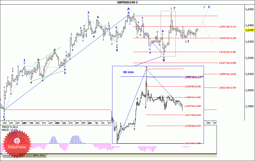 Инструмент продолжает построение коррекционного набора волн, который может быть как в составе повышательного участка тренда, так и самостоятельным нисходящим участком. В рамках повышательной волны может продолжиться повышение котировок с целями, расположенными около расчетной отметки 1,3819, что приравнивается к 161,8% по Фибоначчи, и выше к 39 фигуре, если восходящий участок тренда усложнится и продолжит свое построение. Если повышательный участок тренда завершен, то продолжится построение коррекционного набора волн с целями, находящимися около отметок 1,3634 и 1,3592, что соответствует 61,8% и 76,4% по Фибоначчи, и ниже.