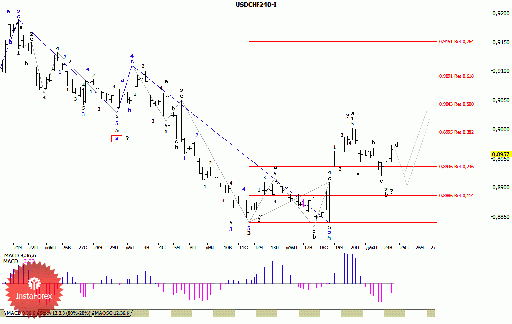 Весь вчерашний день пара USD/CHF медленно отходила от минимума понедельника (0.8920), сумев прибавить в цене чуть более 40 п.п. При этом если все снижение от максимума минувшей пятницы рассматривать в качестве коррекционной структуры, то можно предположить, что 2-я волна или b еще примет более сложную форму, а цена просядет к уровню 89-й фигуры. В то же время в условиях низкой активности торгов валютная пара может продолжить практически горизонтальное движение вдоль отметки 0,8950.