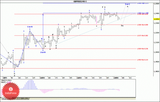 Не смотря на предпринятые неоднократные попытки, в ходе вчерашних торгов пара GBP/USD так и не смогла закрепиться над уровнем 54-й фигуры, что повлекло за собой откат цены более чем на 80 п.п. от внутридневных максимумов. При этом обозначившееся во второй половине дня снижение котировок можно рассматривать в качестве начала будущей 4-й волны, в предполагаемой 3-й, или С. В то же время сложная внутренняя волновая структура этой 3-й волны, или С, еще может принять более протяженную форму, а цена выйдет к отметке 1,5500.