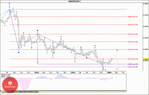 Швейцарская валюта продолжает построение нисходящей волны, которая сильно усложняется. Понижение котировок может продолжиться с целями, расположенными около отметки 0,9244, что приравнивается к 88,6% по Фибоначчи, и ниже к 92 фигуре. После завершения понижательной волны (возможно уже) может начаться построение восходящей волны с целями, расположенными около расчетных отметок 0,9397 и 0,9465, что приравнивается к 61,8% и 50,0% по Фибоначчи.