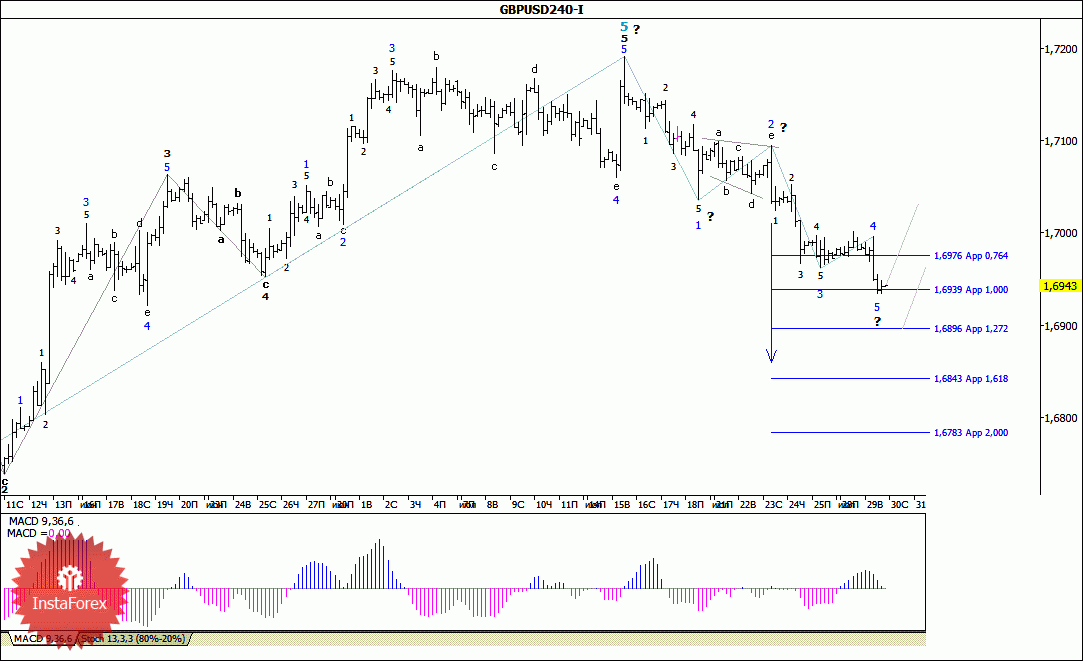 Британская валюта завершила построение повышательного участка тренда. В рамках восходящей коррекционной волны инструмент может начать повышение котировок с целями, находящимися около отметки 1,7050 и 71 фигуры. В рамках построения понижательной волны (возможно 3 в составе понижательного участка тренда) продолжается понижение с целями, расположенными вблизи расчетных отметок 1,6939 и 1,6896, что соответствует 100,0% и 127,2% по Фибоначчи, и ниже. Прорыв нижней границы повышательного коридора натолкнул на вывод о готовности инструмента к построению понижательного набора волн. Неудачная попытка прорыва отметки 1,6939 может привести в отходу котировок от достигнутых минимумов.
