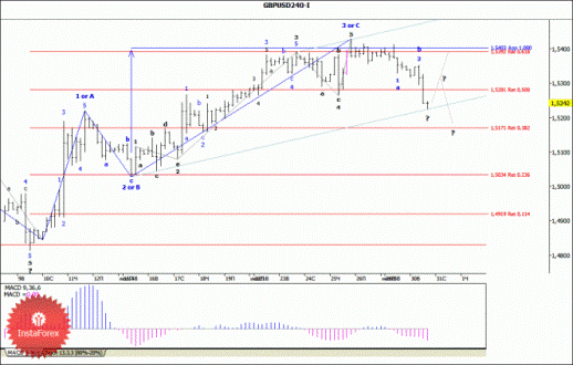 Вчерашним падением к отметке 1.5225 пара GBP/USD подтвердила факт завершения формирования предполагаемой 3-й волны, или С, в пределах восходящего участка тренда, получившего развитие от минимумов 9-10 июля. При этом такое снижение котировок может приобрести более глобальный характер в том случае, если цена сформирует полноценную нисходящую пятиволновую структуру от максимума четверга минувшей недели (1,5430). Пока же, исходя из ситуации, сложившейся к концу вчерашнего дня, валютная пара сохранила шансы для возобновления роста котировок в направлении уровней 54-й фигуры.