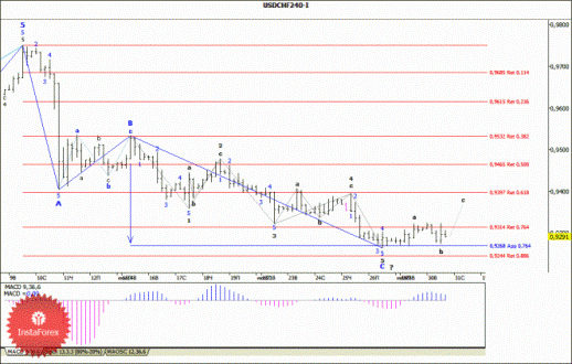 Швейцарская валюта продолжает построение нисходящей волны, которая сильно усложняется. Понижение котировок может продолжиться с целями, расположенными около отметки 0,9244, что приравнивается к 88,6% по Фибоначчи, и ниже к 92 фигуре. После завершения понижательной волны (возможно, уже) может начаться построение восходящей волны с целями, расположенными около расчетных отметок 0,9397 и 0,9465, что приравнивается к 61,8% и 50,0% по Фибоначчи.