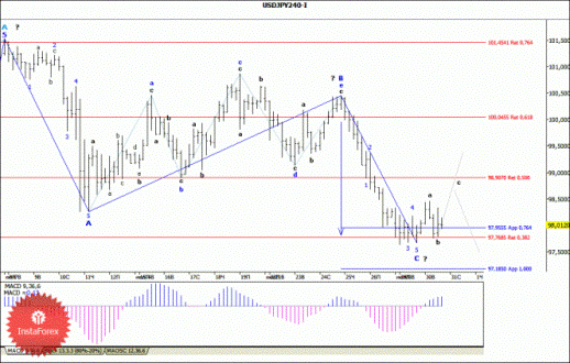 Инструмент значительно усложнил волновую структуру, но построение понижательного участка тренда продолжается. Понижение котировок может продолжиться с целями, расположенными около отметок 97,76 и 97,18, что соответствует 38,2% и 100,0% по Фибоначчи. После завершения построения предполагаемой волны С начнется повышение с целями, находящимися около отметок 98,90 и 100,04, что приравнивается к 50,0% и 61,8% по Фибоначчи. Неудачная попытка прорыва отметки 97,76 (их было уже две) натолкнет на вывод о готовности инструмента к построению восходящей волны.