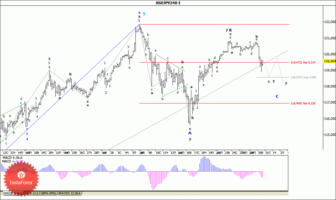 В ходе вчерашних торгов паре USD/JP удалось продолжить еще на 70 б.п. обозначившееся накануне нисходящее движение. При этом соотношение между размерностями волн а и с, в предполагаемой С, допускает вероятность дальнейшего снижения цены к отметке 118,55. В то же время в случае если внутренняя волновая структура волны С, начнет принимать более сложную форму, то текущее снижение котировок от максимума 23 декабря трансформируется в полноценную пятиволновую структуру.