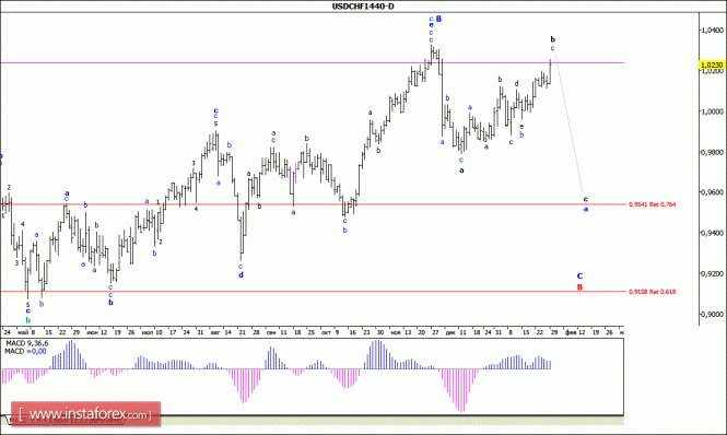 Не сумев выполнить разворот от уровня 1.0200, в последний день минувшей недели пара USD/CHF прибавила в цене более 120 п.п. и завершила день у отметки 1,0230. При этом, несмотря на значительный рост котировок, текущая волновая ситуация позволяет предполагать, что валютная пара по-прежнему остается в стадии формирования восходящей коррекции, которую можно квалифицировать как волну b, в а, в С, в С, которая сильно усложнила свою волновую структуру. Если это так, то от уже достигнутого в пятницу максимума, или немного выше, цена может возобновить снижение и все же обозначить начало будущей волны с, в а, в С, в С.