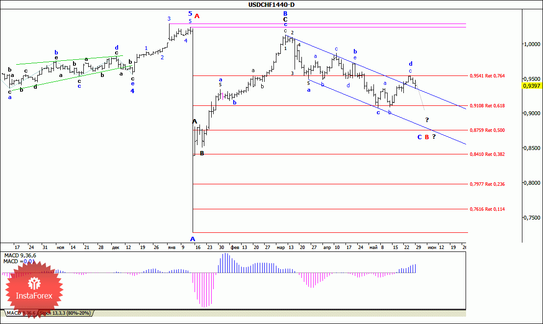 Неудачная попытка пары USD/CHF в начале минувшей недели продолжить восходящее движение, завершилась отскоком цены почти на 200 п.п., ниже отметки 0,9350. Таким образом, можно предположить, что валютная пара завершает формирование волны d, в волне С, в В, в составе сложной коррекционной структуры, получившей развитие от мартовского максимума. Если это так, то скорее всего обозначившееся снижение котировок продолжится как минимум к уровню 90 фигуры.