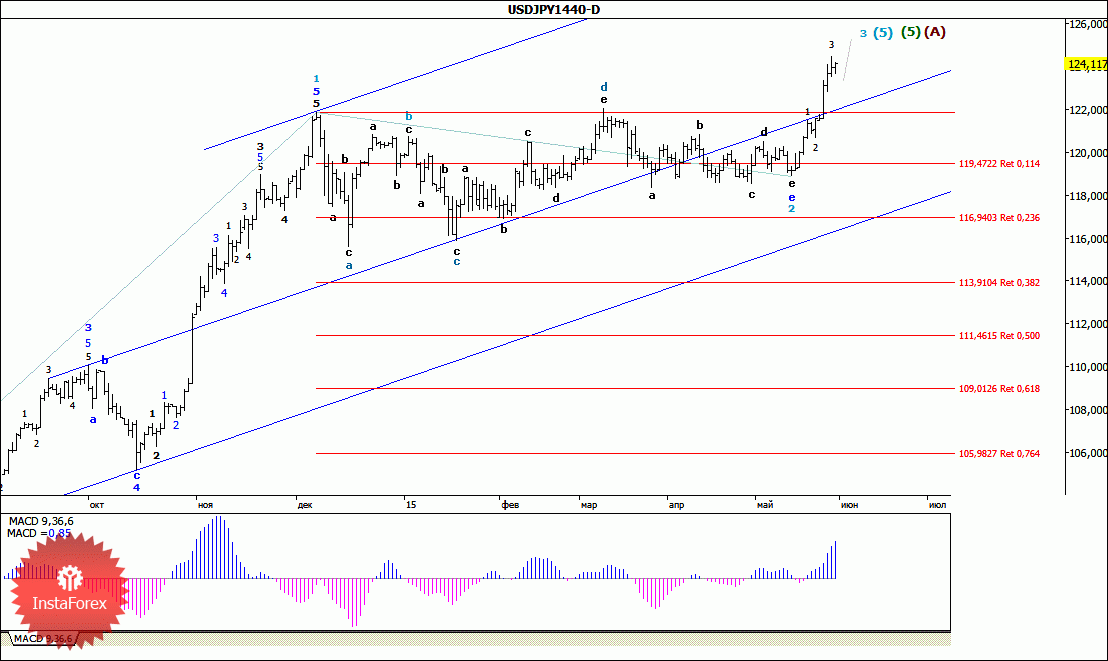 Начав минувшую неделю с восходящего движения, пара USD/JPY, прорвав декабрьский и мартовский максимумы, смогла закрепиться над уровнем 124-й фигуры. Таким образом, в связи с тем, что внутренняя волновая структура волны (5), в (А), значительно усложнила свою волновую структуру, то минимум от 14 мая можно рассматривать как завершение волны 2, в (5), в (5) в (А). При этом рост котировок к отметке 124.45 является, скорее всего, началом волны 3, в (5), в (5), первые возможные цели которой расположены над уровнем 125 фигуры.
