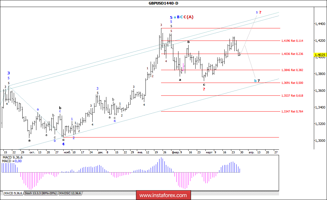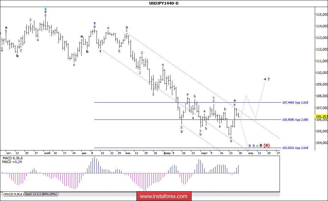 Неудачный пробой уровня 105-й фигуры привел в начале минувшей недели к отскоку цены по паре USD/JPY более чем на 200 б.п., к уровню 107,00. Таким образом, похоже на то, что валютная пара практически завершила процесс формирования принявшей вид наклонного коррекционного треугольника 4-й волны, в 3-й, в с, в В, в (В). Если это так, то от уже достигнутого в прошедшую среду максимума валютная пара выполнит разворот и все же обозначит начало 5-й волны, в 3-й, в с, в В, в (В). В то же время следует отметить, что дальнейший рост котировок может позволить рассматривать минимум от 26 марта (104,62) в качестве завершения всей 3-й волны, в 3-й, в с, в В, в (В), а также потребует внесения соответствующих изменений в ее волновую разметку.