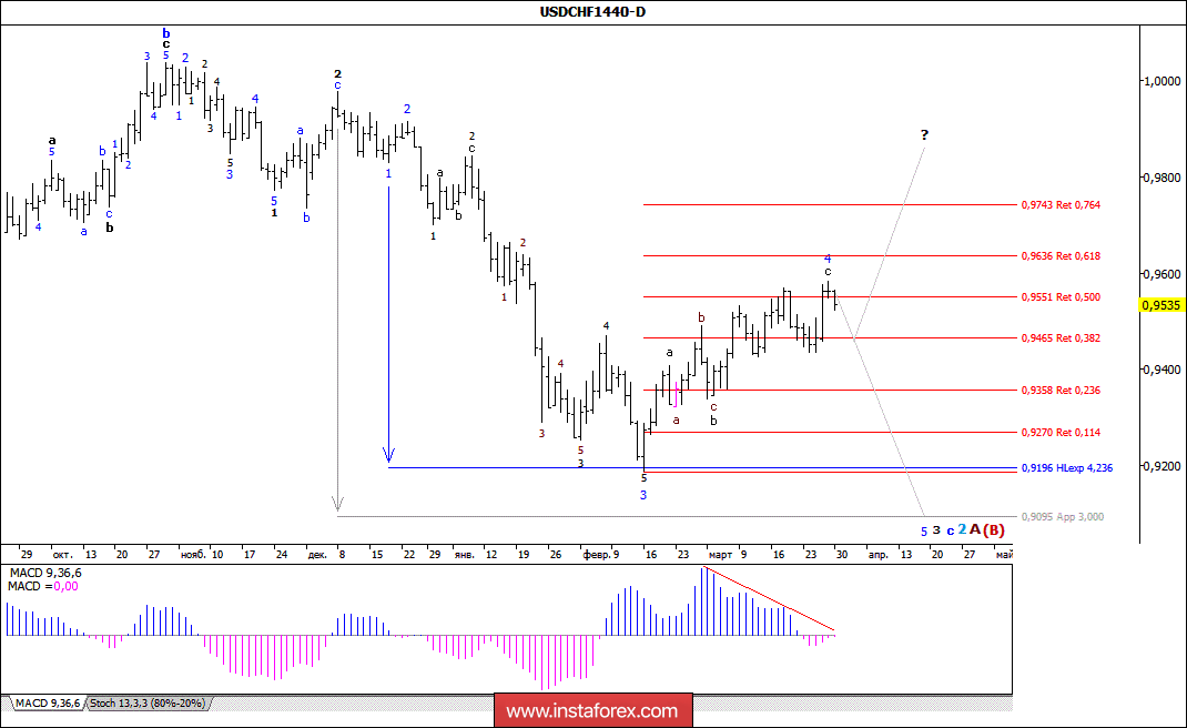 Так и не сумев продолжить обозначившееся было снижение, торги минувшей недели пара USD/CHF начала с восходящего движения и, отработав повторно целевой уровень 0,9550, уже в четверг достигла отметки 0,9585. При этом похоже на то, что, несмотря на достаточно сильную дивергенцию MACD_ака, валютная пара еще больше усложнила внутреннюю волновую структуру 4-й волны, в 3-й, в с, во 2-й, в A, в (В). Если это так, то от максимума минувшего четверга валютная пара все же возобновит снижение котировок, перейдя в стадию формирования будущей 5-й волны, в 3-й, в с, во 2-й, в A, в (В).