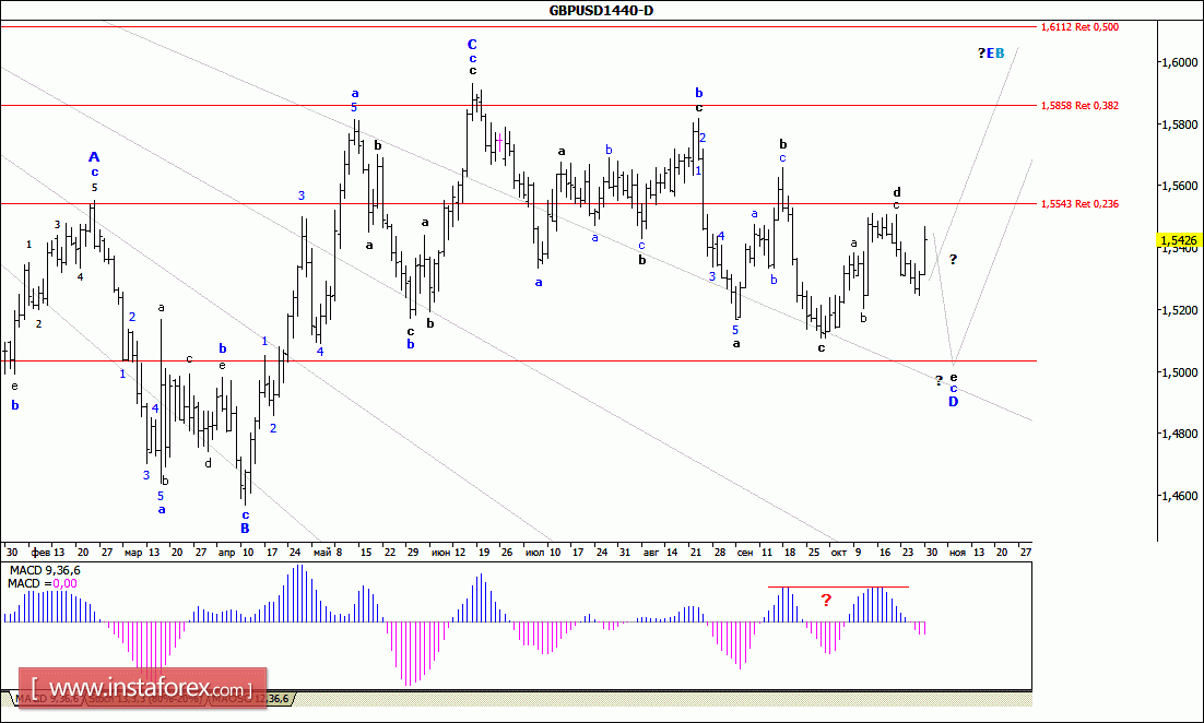 Фунт стерлингов находится в стадии построения понижательного участка тренда, который очень усложняет свою внутреннюю волновую структуру. Понижение котировок может продолжиться с целями, расположенными около 50 и 48 фигур, в рамках предполагаемой волны e в с в D в B. В рамках повышательной волны, предположительно E в B, повышение котировок может продолжиться с целями, расположенными вблизи отметок 1,5543 и 1,5858, что соответствует 23,6% и 38,2% по Фибоначчи.