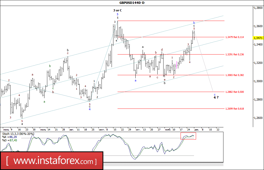 Несмотря на предпринятые усилия, пара GBP/USD так и не смогла выполнить разворот и, возобновив в минувший вторник восходящее движение, к закрытию пятничной сессии достигла отметки 1,3550. В сложившихся при этом условиях появились основания, позволяющие рассматривать максимум первой декабрьской сессии в качестве вершины, принявшей вид пяти-волновой структуры, волны с, в b, в 4-й. Если это так, то от уже достигнутых максимумов, или после тестирования уровня 36-й фигуры, валютная пара все же начнет снижение котировок, перейдя в стадию формирования будущей волны с, в 4-й.