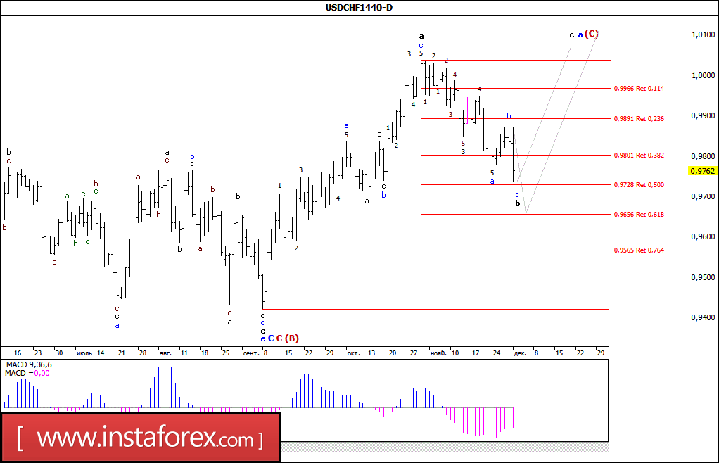 Торги минувшей недели пара USD/CHF начала с восходящего движения, однако, так и не сумев выполнить разворот, к концу пятничной сессии упала к отметке 0,9735. Таким образом, сложившаяся волновая ситуация позволяет рассматривать максимум от 1 ноября (1,0037) как вершину волны а, в а, в (С), а последующее снижение цены как процесс формирования коррекционной волны b, в этой а, в (С). Если это так, то от минимума последнего дня прошедшей недели, или после достижения отметки 0,9655, валютная пара все же возобновит рост котировок, перейдя в стадию формирования волны с, в а, в (С).