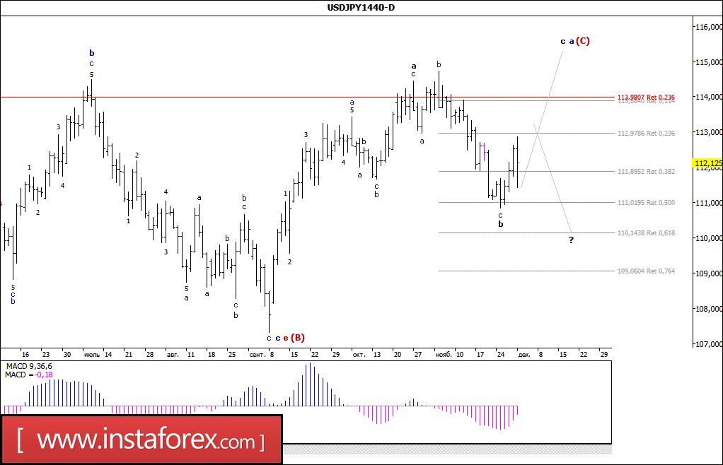Пара USD/JPY продолжает построение повышательной волны (С). Таким образом, повышение котировок может возобновиться в рамках волны с, в а, (С) с целями, расположенными около расчетных отметок 115,43 и 116,32, что соответствует 61,8% и 76,4% по Фибоначчи (эти цели еще будут пересмотрены). Предполагаемая волна b, если не усложнит свою внутреннюю структуру, предположительно завершена.