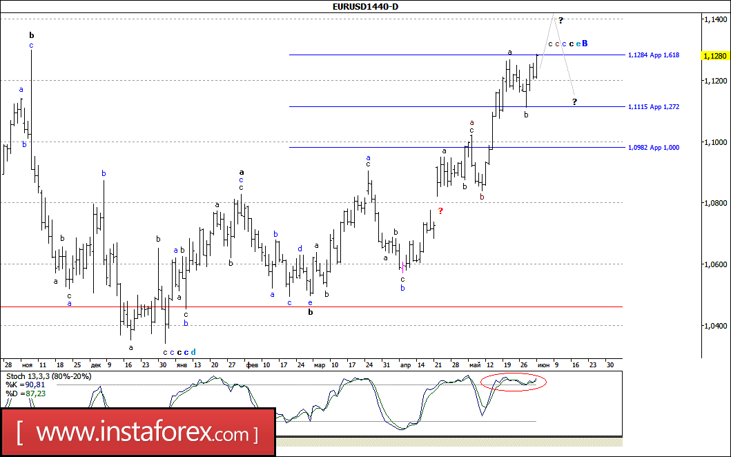 После снижения практически к уровню 11-й фигуры, в минувший вторник пара EUR/USD возобновила восходящее движение и в пятницу смогла отработать отметку 1,1285. При этом можно предположить, что валютная пара осталась в стадии формирования принявшей несколько более сложную форму внутренней волновой структуры волны с, в с, в с, в е, в В. Если это так, то, несмотря на по-прежнему находящиеся в зоне перекупленности индикаторы, валютная пара продолжит рост котировок к уровню 1,1400, или даже к отметке 1,1470.