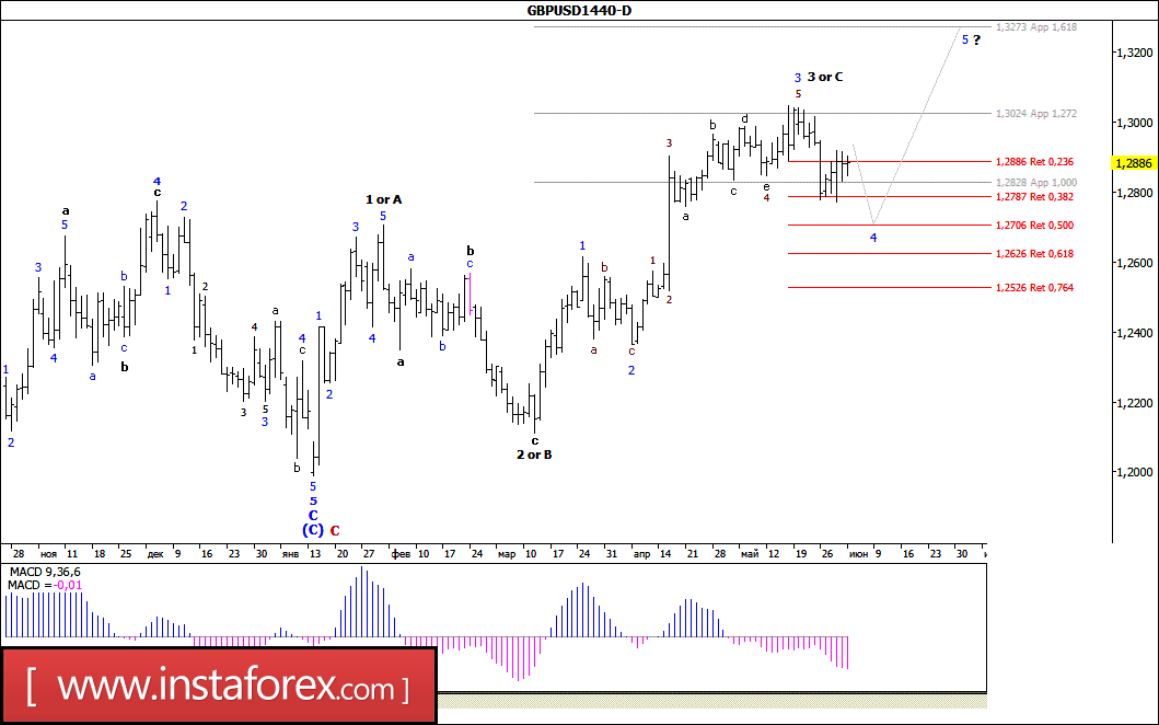 Пробой достигнутого 26-го мая минимума спровоцировал отскок цены по паре GBP/USD более чем на 150 п.п. и неоднократное тестирование уровня 29-й фигуры. Складывающаяся при этом волновая ситуация позволяет предполагать, что неспособность валютной пары развить более значимое восходящее движение может спровоцировать возобновление снижения котировок к уровню 1,2700, а также существенное усложнение внутренней волновой структуры 4-й волны, в 3-й (или С).