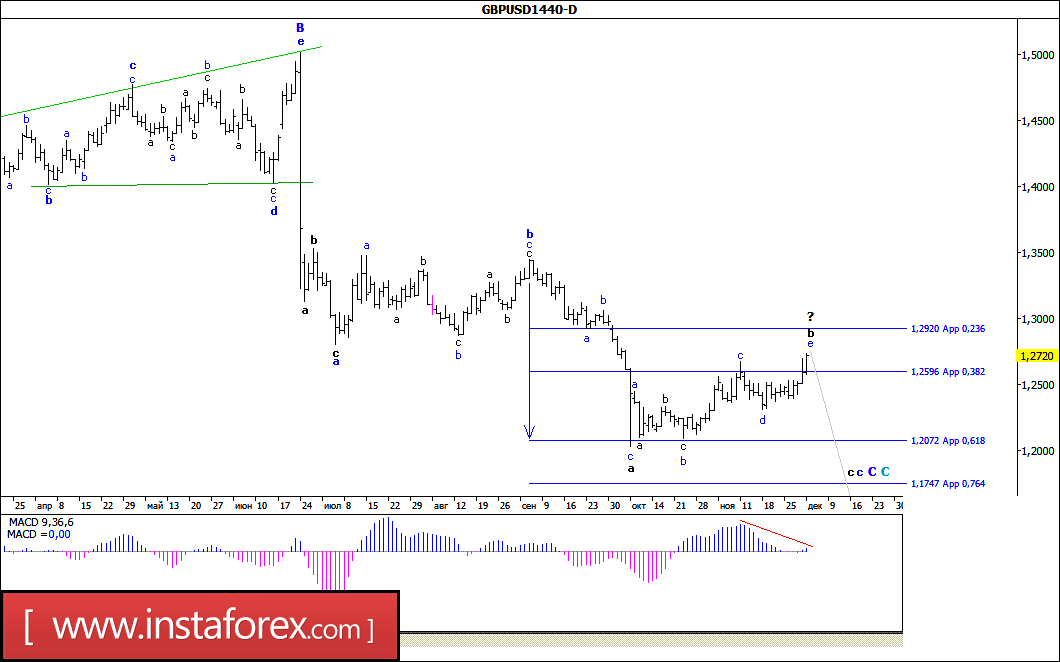 Фунт стерлингов находится в стадии построения понижательной волны С в С. Понижение котировок может возобновиться с целями, расположенными около расчетных отметок 1,2072 и 1,1747, что соответствует 61,8% и 76,4% по Фибоначчи в рамках волны с в с в С. В рамках повышательной волны повышение котировок продолжается (хотя волна выглядит уже завершенной) с целями, расположенными около расчетной отметки 1,2920, что соответствует 23,6% по Фибоначчи. Неудачная попытка прорыва отметки 1,2920 наведет на мысль о готовности инструмента к построению нисходящей волны.