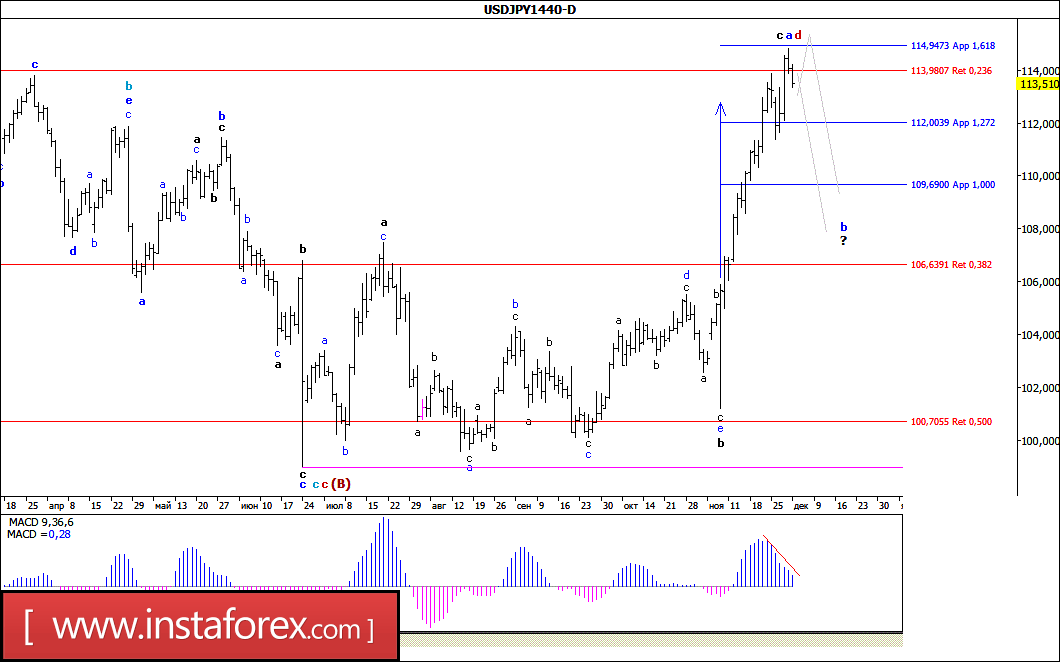 После просадки цены к отметке 111,35, в минувший вторник пара USD/JPY смогла возобновить восходящее движение и уже в четверг остановилась в 20 б.п. от уровня 115-й фигуры. При этом можно предположить, что валютная пара оставалась в стадии формирования волны с, в а, в d, в (В), которая к закрытию пятничной сессии приняла вполне завершенный вид. Если это так и волна с, в а, в d, в (В) не станет еще больше усложнять свою волновую структуру, то от уже достигнутого максимума валютная пара может сформировать разворот, обозначив тем самым начало будущей волны b, в d, в (В).