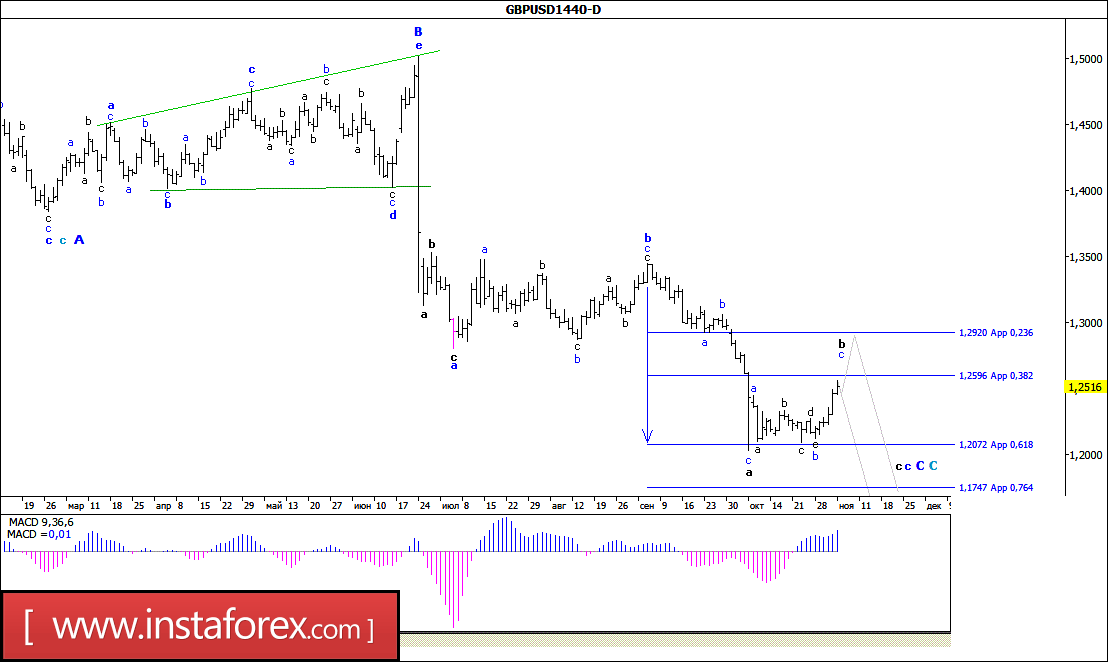 Фунт стерлингов находится в стадии построения понижательной волны С в С. Понижение котировок может возобновиться с целями, расположенными около расчетных отметок 1,2072 и 1,1747, что соответствует 61,8% и 76,4% по Фибоначчи в рамках волны с в с в С. В рамках повышательной волны повышение котировок началось с целями, расположенными около расчетных отметок 1,2596 и 1,2920, что соответствует 38,2% и 23,6% по Фибоначчи. Неудачная попытка прорыва отметки 1,2596 может привести к завершению построения коррекционной волны.