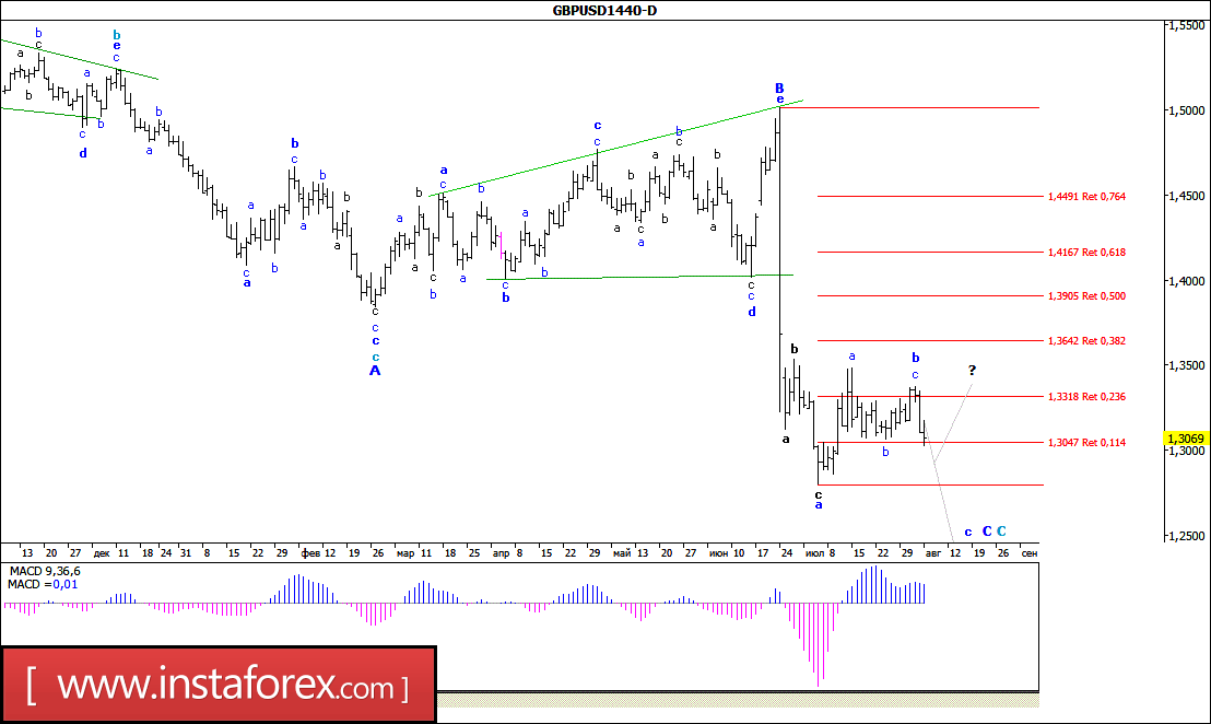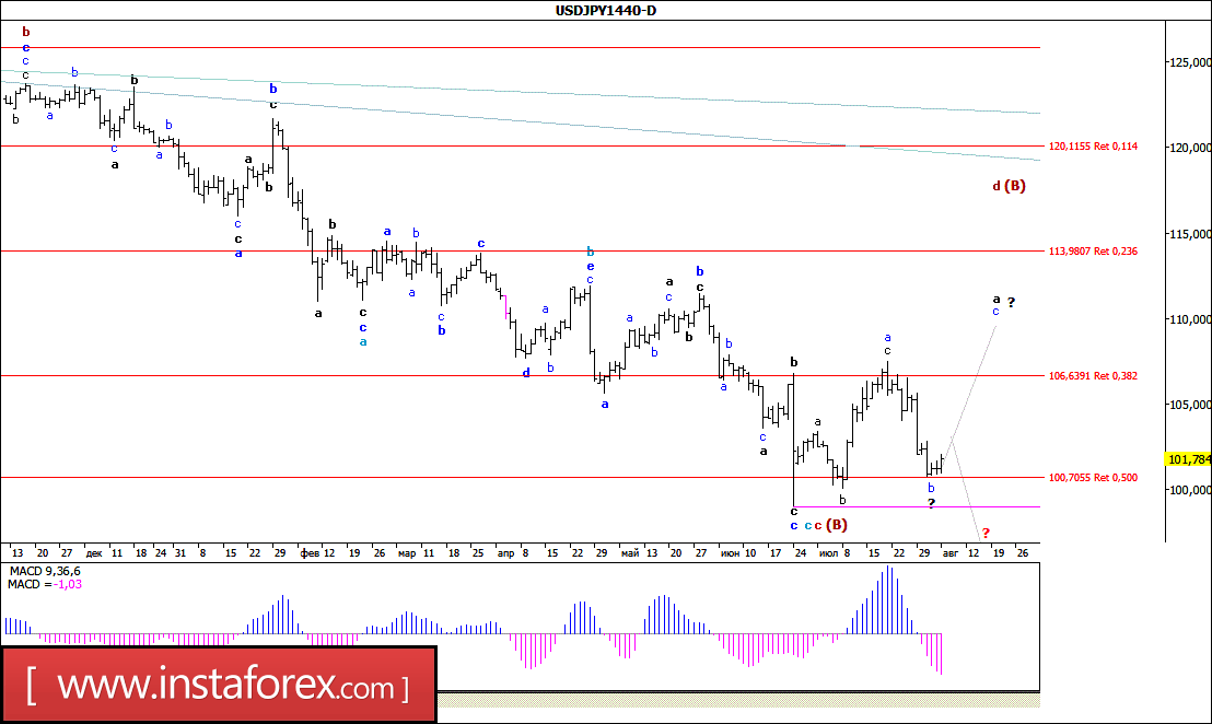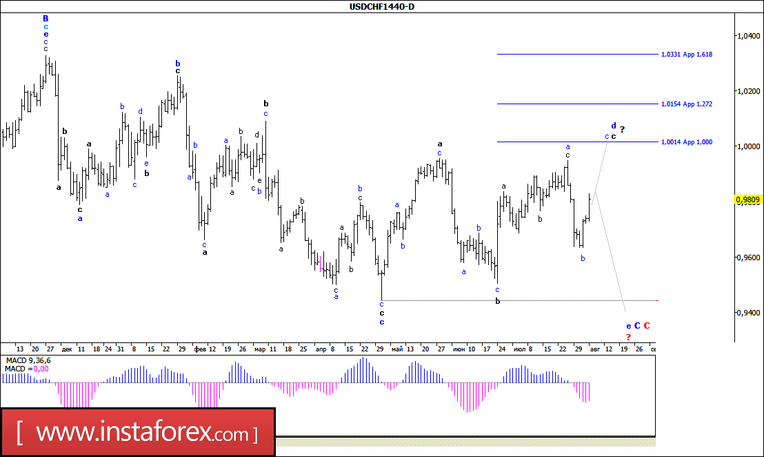 Как и ожидалось, в ходе торгов минувшей недели пара USD/CHF все же смогла возобновить восходящее движение и в пятницу закрепилась над уровнем 98-й фигуры. Таким образом, складывающаяся волновая ситуация позволяет предполагать, что валютная пара может продолжить наметившийся рост котировок, что, в свою очередь, приведет к усложнению внутренней волновой структуры волны с, в d, в С, в С с перспективой достижения уровня ценового паритета. В то же время в настоящий момент не существует значимых препятствий для продолжения начавшегося 27 июля снижения цены и подтверждения перехода валютной пары в стадию формирования волны е, в С, в С.