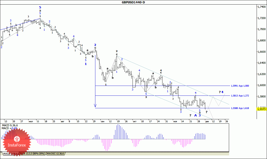 Оттолкнувшись от отметки 1.5585, в начале минувшей недели пара предприняла не совсем удачную попытку завершить 3-ю волну и перейти в стадию формирования 4-й волны, в составе понижающего тренда, берущего начало еще в середине июля. При этом в пятницу на волне повышенного интереса рынка к доллару валютная пара упала ниже ранее достигнутого минимума к отметке 1,5570. Таким образом, в результате возобновления нисходящего движения внутренняя волновая структура 5-й волны, в 5-й, в 3-й, может принять более сложную форму с перспективой снижения цены к отметке 1,5340. В то же время, несмотря на такое динамичное снижение и пробой ранее достигнутых минимумов, нельзя исключать вероятности возобновления формирования 4-й волны, которая в таком случае, может принять вид горизонтального (или наклонного) треугольника.