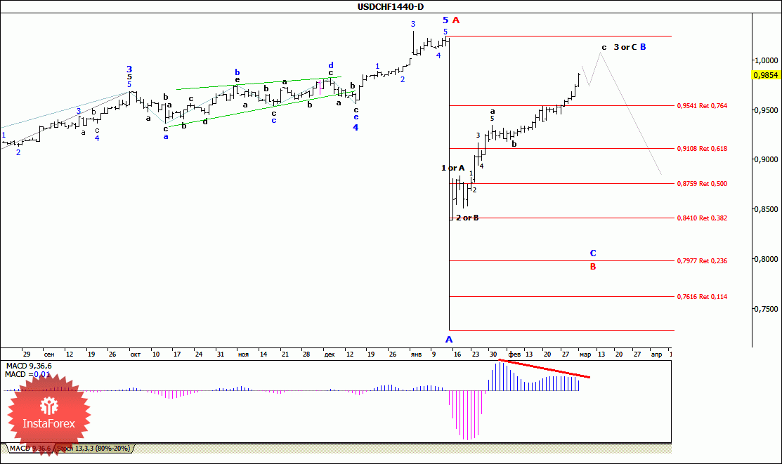 Несмотря на имевшиеся предпосылки для выполнения разворота от коррекционного уровня 76.4% и значительную дивергенцию MACD_ака, в ходе торгов минувшей недели пара USD/CHF все же продолжила рост котировок, протестировав в пятницу отметку 0,9850. Таким образом, похоже на то, что предполагаемая 3-я волна, или С, в В, приняв еще более сложную форму, нацелилась на достижение уровня ценового паритета. При этом в условиях, когда валютные резервы только за один месяц увеличились с 498.5 млрд до 509.3 млрд и при отрицательной банковской ставке, валютная пара может в любой момент начать нисходящее движение швейцарского франка, перейдя в стадию формирования волны С, в В.