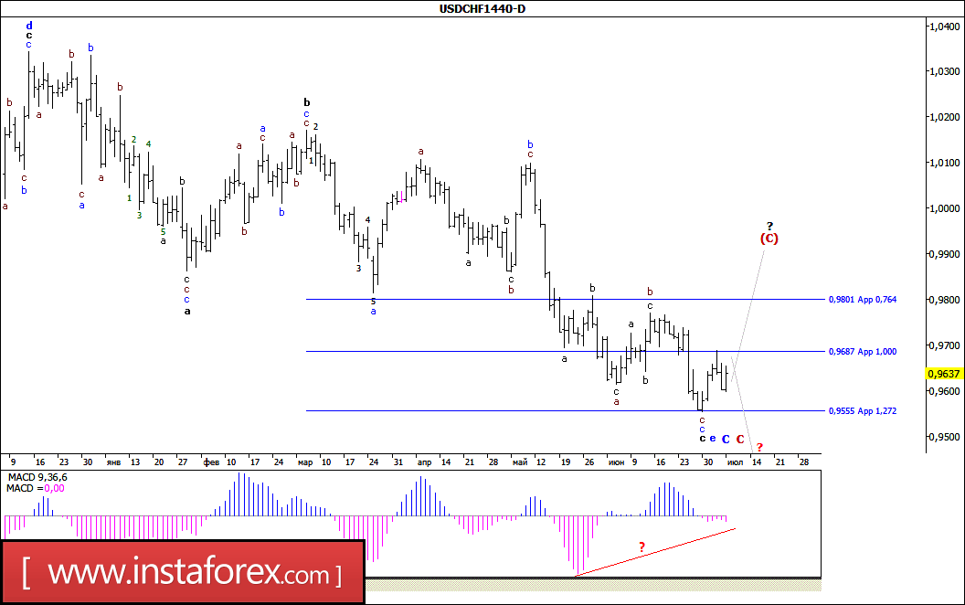 Волновая разметка инструмента предполагает построение усложненной волны е, в С, в С, в (В). Инструмент может продолжить снижение с целями, расположенными вблизи расчетной отметки 0,9555, что приравнивается к 127,2% по Фибоначчи, и ниже, около 94 фигуры. После завершения построения этой волны, ожидается протяженной повышение котировок в рамках предполагаемой волны (С). Неудачная попытка прорыва отметки 0,9555 привела к отхода котировок от достигнутых минимумов.