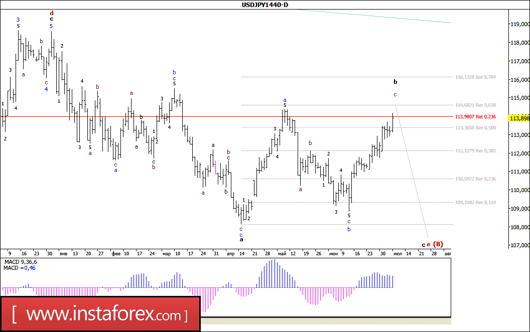 Как и ожидалось, торги минувшей недели пара USD/JPY начала с восходящего движения, что и привело в пятницу к пробою уровня 114-й фигуры. Складывающаяся при этом волновая ситуация позволяет предполагать, что валютная пара оставалась в стадии формирования, близящейся к своему завершению, волны с, в составе принявшей значительно более сложную форму, волны b, в е, в (В). Если это так, то отработка расчетной цели в районе отметки 114,60 может привести к развороту цены против доллара, что в свою очередь обозначит начало будущей волны с, в е, в (В).