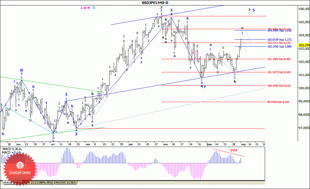 Начав торги минувшей недели с восходящего движения, пара USD/JPY смогла прибавить в цене более 250 б.п., достигнув отметки 103,75. Таким образом, появились основания для предположений о том, что валютная пара перешла в стадию формирования 3-й волны, или с, (в 5-й), с отдаленной перспективой роста к уровню 106-й фигуры. В то же время предпосылки, позволяющие рассматривать весь рост цены от минимума 4 февраля в качестве составной части более сложной коррекционной структуры, еще не утратили своей актуальности.