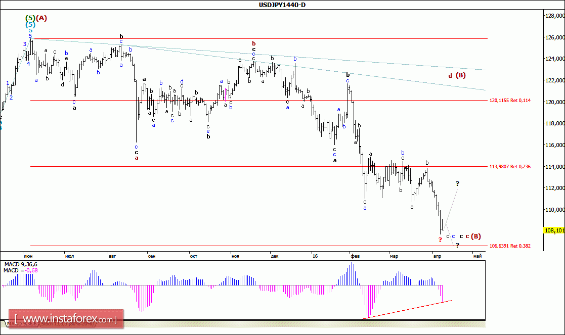 Торги минувшей недели пара USD/JPY начала с нисходящего движения, которое после пробоя мартовского минимума (110.66) приобрело обвальный характер, позволив цене упасть к отметке 107,65. Таким образом, внутренняя волновая структура волны с, в (В), все же приняла значительно более сложную форму, что, в свою очередь, открыло валютной паре путь для снижения в район отметки 106,65106,50. В то же время возвратившиеся в зону перепроданности индикаторы и достаточно сильная дивергенция MACD_ака указывают на возможность перехода валютной пары в стадию формирования будущей волны d, в (В), практически от уже достигнутого в четверг минимума.