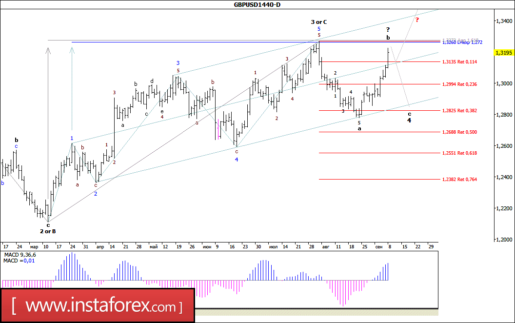 Так и не сумев возобновить нисходящее движение, торги минувшей недели пара GBP/USD начала с роста котировок и, прибавив в цене более 300 п.п., завершила пятничную сессию пробоем уровня 32-й фигуры. При этом можно предположить, что, несмотря на возврат цены в район августовских максимумов, валютная пара пока оставалась в стадии формирования волны b, в предполагаемой 4-й, в составе повышающего участка тренда, берущего начало еще от минимумов начала года. В то же время следует отметить, что в случае роста валютной пары выше отметки 1,3270, может возникнуть необходимость в уточнении волновой разметки 4-й волны, в 3-й (или С).