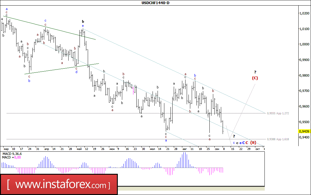 Несмотря на имевшиеся предпосылки для возобновления восходящего движения, торги минувшей недели пара USD/CHF начала со снижения и потеряв более 190 п.п., в конце пятничной сессии достигла отметки 0,9420. Сложившаяся при этом волновая ситуация позволяет предполагать, что валютная пара оставалась в стадии формирования значительно усложнившей свою волновую структуру волны с, в е, в С, в С, в (В). Если это так и пробой уровня 94-й фигуры не приведет к развороту цены в пользу доллара, то соотношение между размерностями волн а и с, в е, в С, в С, в (В), позволяет валютной паре продолжить снижение котировок вплоть до уровня 0,9200.