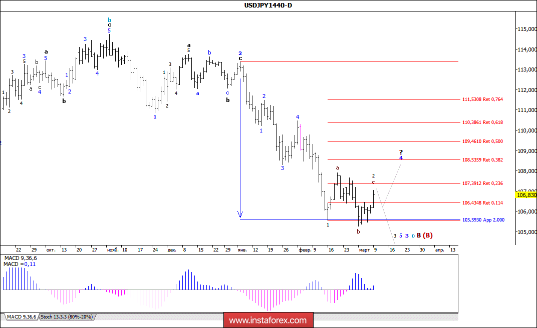 Пара USD/JPY продолжает построение предполагаемой волны (С). Таким образом, понижение котировок может продолжиться в рамках волны 5, в 3, в с, в В, в (В) с целями, находящимися ниже расчетной отметки 105,59, что приравнивается к 200,0% по Фибоначчи, около 104 и 102 фигур. В рамках волны 4, в с, в В, в (В) возможен отход котировок от достигнутых минимумов с целями, находящимися около отметок 108,53 и 109,46, что соответствует 38,2% и 50,0% по Фибоначчи.