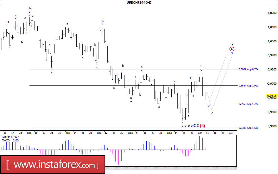 В минувший вторник, после пробоя отметки 0,9770, пара USD/CHF начала нисходящее движение и, потеряв около 190 п.п., в конце недели протестировала уровень 96-й фигуры. При этом в результате такого существенного снижения цены появились основания, позволяющие рассматривать максимум от 8 августа (0,9770) в качестве вершины 1-й волны, в составе будущей (С). Если это так, то завершение 2-й волны, в (С), приведет к возобновлению роста котировок и обозначит начало 3-й волны, в (С).