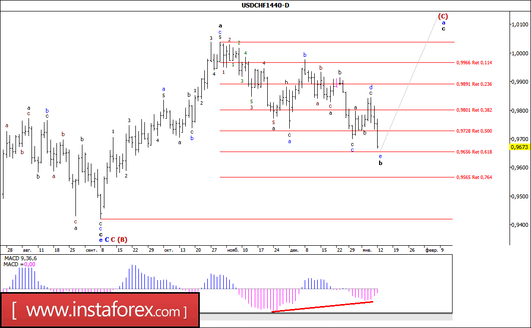 Попытка продолжить развитие обозначившегося ранее восходящего движения завершилась неудачей и, возобновив в минувшую среду снижение, пара USD/CHF потеряла около 180 п.п., достигнув при этом отметки 0,9665. Таким образом, в связи с пробоем валютной парой уровня 97-й фигуры (минимум от 2 января), валютная пара осталась в стадии формирования приобретшей признаки наклонного треугольника волны b, в а, в (С). Если это так, то достаточно сильная дивергенция MACD_ака указывает на то, что отработка валютной парой коррекционного уровня 61,8% все же приведет к началу формирования первых образующих волн в составе будущей волны с, в а, в (С).