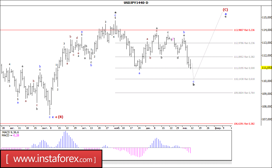 Как и ожидалось, торги минувшей недели пара USD/JPY начала с нисходящего движения и, потеряв в цене около 240 б.п., в конце пятничной сессии повторно пробила уровень 111-й фигуры. При этом можно предположить, что валютная пара находилась в завершающей стадии формирования волны с, в b, в а, в (С). Если это так, то практически от уже достигнутого в пятницу минимума (110,90), или после снижения к расчетному коррекционному уровню 61,8% (110,15), валютная пара возобновит рост котировок, обозначив тем самым начало будущей волны с, в а, в (С).