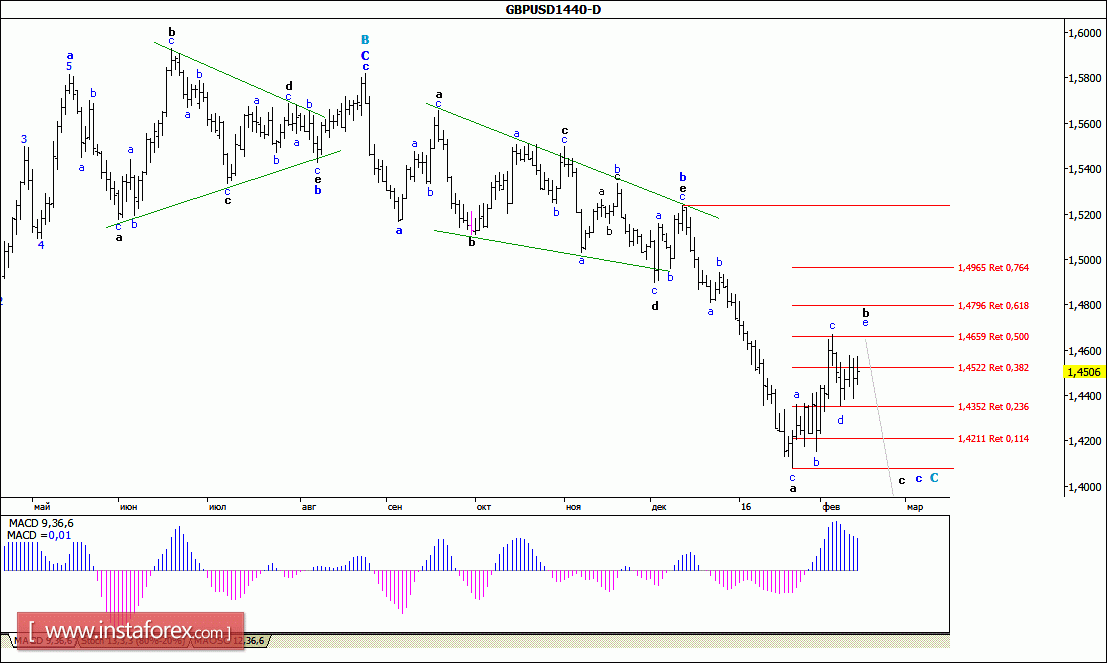 Всю минувшую неделю пара GBP/USD провела в достаточно широком ценовом диапазоне, преимущественно торгуясь вокруг уровня 45-й фигуры. При этом, несмотря на то, что волна b, в с, в С, приняла вполне завершенный вид, нельзя исключать еще большего усложнения ее внутренней волновой структуры и трансформации в одну из форм коррекционного треугольника. Если это так, то практически от текущих ценовых значений, или после повторного тестирования уровня 1.4600, цена возобновит нисходящее движение и обозначит начало будущей волны c, в с, в С.