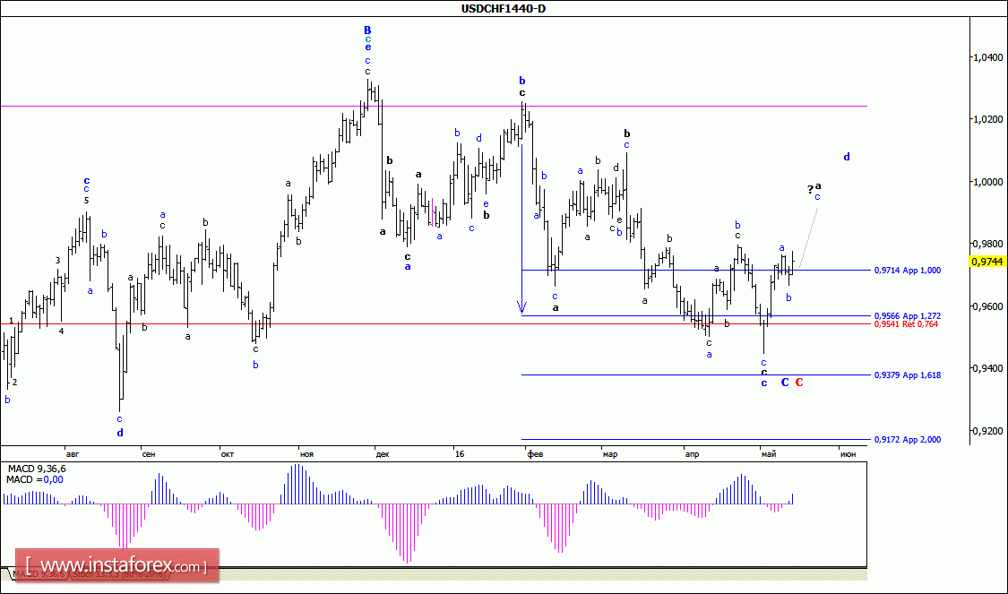 Почти всю минувшую неделю пара USD/CHF провела в диапазоне, торгуясь вокруг уровня 97-й фигуры и только в пятницу, обновив достигнутый во вторник максимум, выросла выше отметки 0,9770. Складывающаяся при этом волновая ситуация позволяет предполагать, что валютная пара все же перешла в стадию формирования волны d, в С, в С, в которой ее внутренняя волна а еще не выглядит завершенной. Если это так, то в процессе развития волновой структуры этой волны а, в d, в С, цена может продолжить возобновившееся восходящее движение, вплоть до уровня 0,9900.