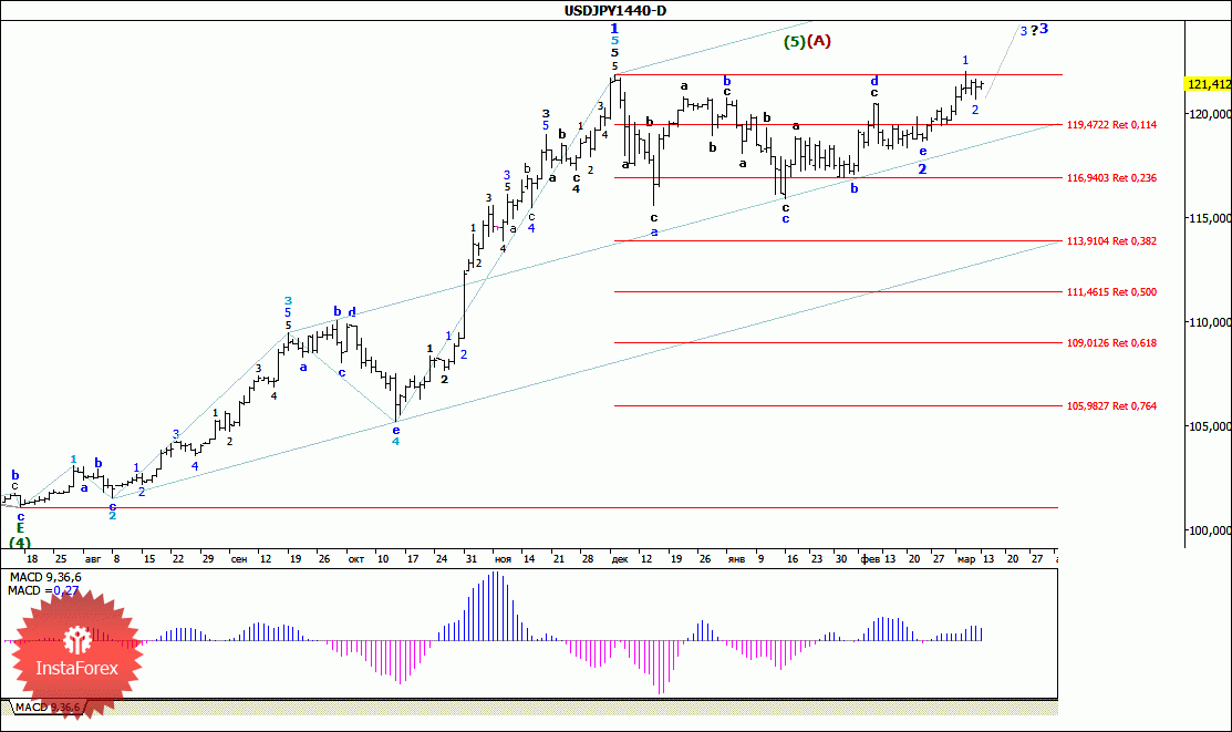 Начав минувшую неделю с восходящего движения, во вторник пара USD/JPY смогла пробить максимум января и после тестирования уровня 122.00, продолжала торговаться вокруг уровня 121-й фигуры. Таким образом, сложившаяся волновая ситуация вынуждает предполагать, что восходящий участок тренда, берущий начало еще во второй половине июля прошлого года, значительно усложняет свою волновую структуру. При этом максимум от 7 декабря можно рассматривать как вершину 1-й волны, в (5-й), в (А). Если это так, то можно предположить, что после 26 февраля валютная пара перешла в стадию формирования 3-й волны, в (5-й), в (А), первые возможные цели которой расположены вблизи уровня 126,00.