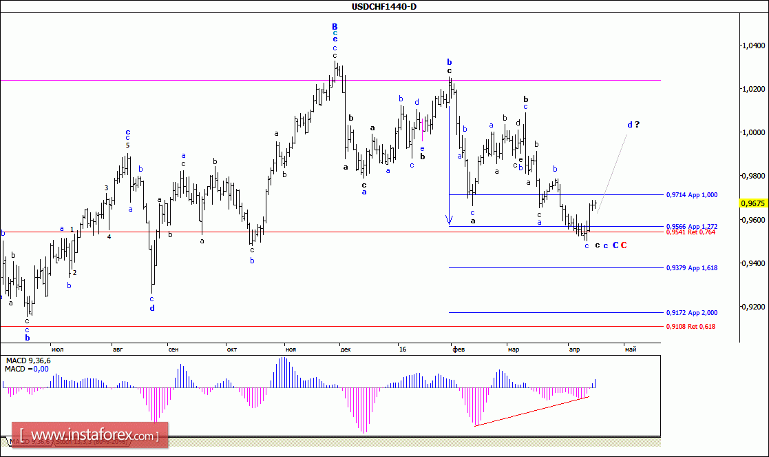 В целом ожидаемо, попытка тестирования парой USD/CHF уровня 95-й фигуры завершилась в начале минувшей недели неудачей и последующим отскоком цены почти на 190 п.п. от достигнутого во вторник минимума. Сложившаяся при этом волновая ситуация позволяет предполагать, что валютная пара все же завершила процесс формирования волны с, в, с, С, в С и обозначила начало будущей волны d, в С, в С. Если это так, то отрабатывая дивергенцию MACD_ака, валютная пара может продолжить рост котировок, с перспективой возврата к уровню ценового паритета.