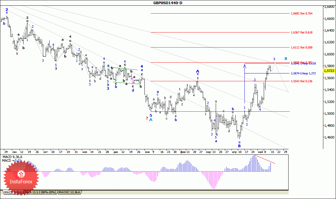 Публикация данных, свидетельствующих о замедлении темпов роста американской экономики и снижении основных макроэкономических показателей, не позволили паре EUR/USD в ходе торгов минувшей недели развить обозначившееся ранее снижение, в связи с чем, возобновив во вторник восходящее движение, цена достигла отметки 1,1465. Таким образом, в ситуации, когда валютной паре удалось пробить уровень 14 фигуры, повышающий участок тренда, формирующийся от минимума 13 апреля, принял вид полноценной пятиволновой структуры, являющейся, скорее всего, составной частью волны а в составе более сложной и протяженной коррекционной волны В. При этом, исходя из внутренней волновой размерности волны а и достаточно сильной дивергенции MACD_ака, можно предположить, что ее расчетные цели расположены в диапазоне между уровнями 15 и 17 фигур.